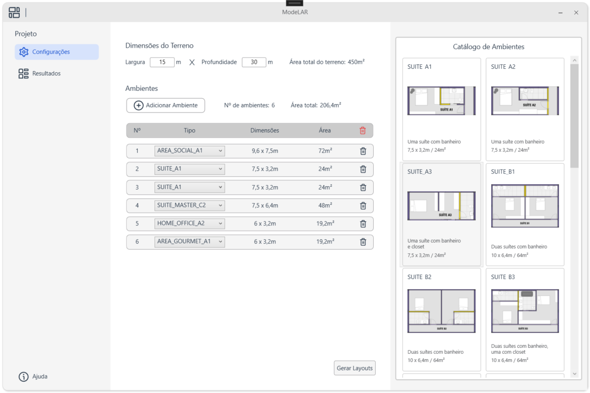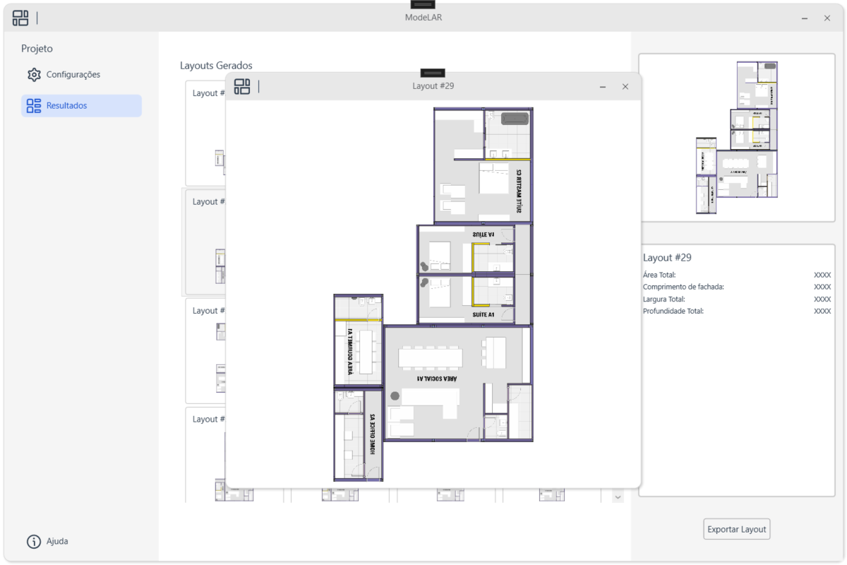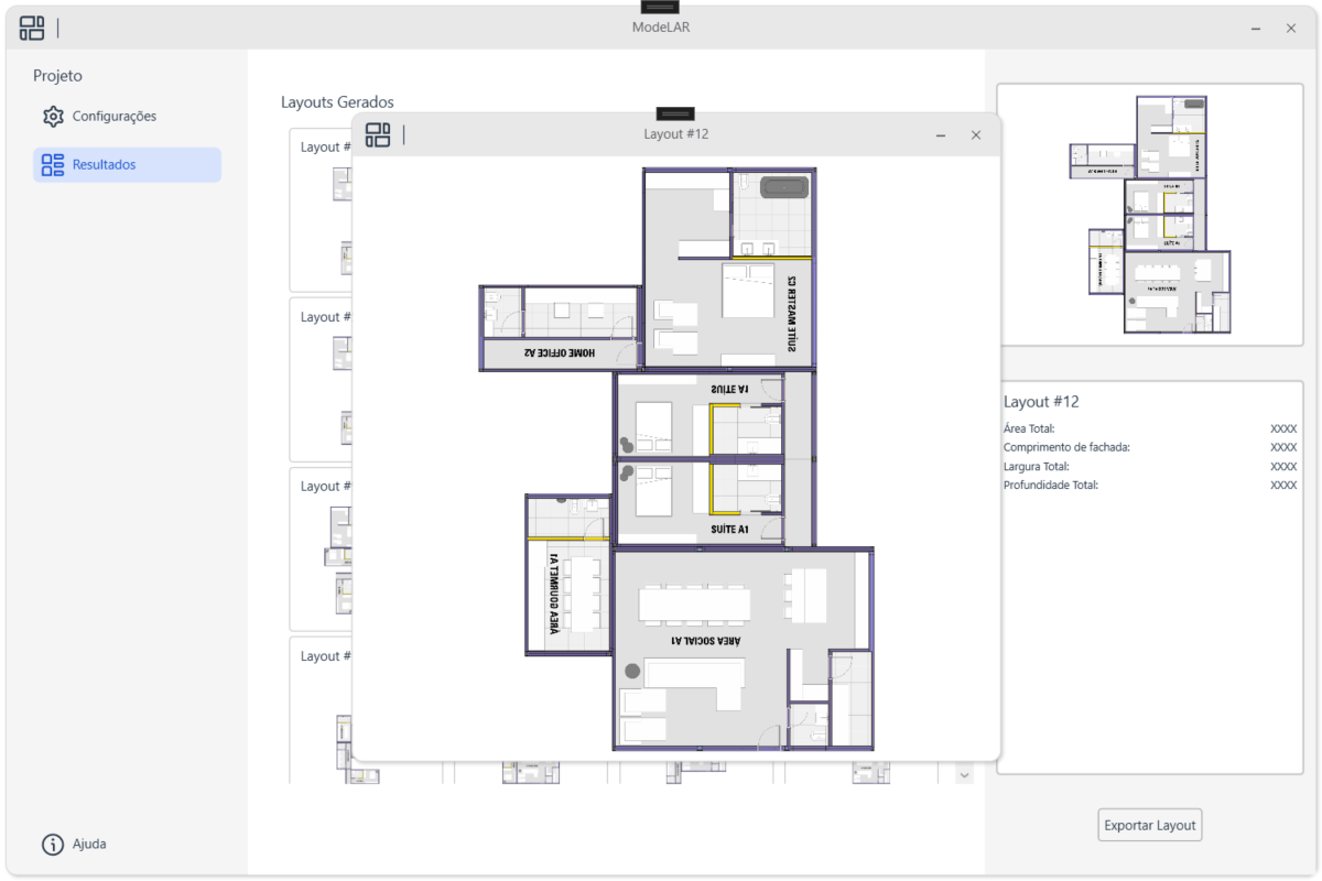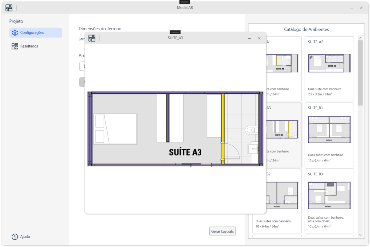 A ferramenta disponibiliza uma interface que permite ao usuário configurar as dimensões de um terreno, visualizar os módulos disponíveis e adicioná-los à uma lista. Após a seleção dos módulos desejados para a residência, o usuário pode gerar as opções de layout. A ferramenta executa um algoritmo de design generativo, criando todas as opções de layout possíveis e validando regras de conex~]ao entre cômodos. Por fim, o usuário pode visualizar as opções criadas e escolher a que deseja exportar para o modelo atual do Revit.