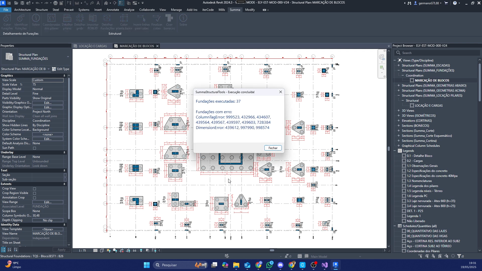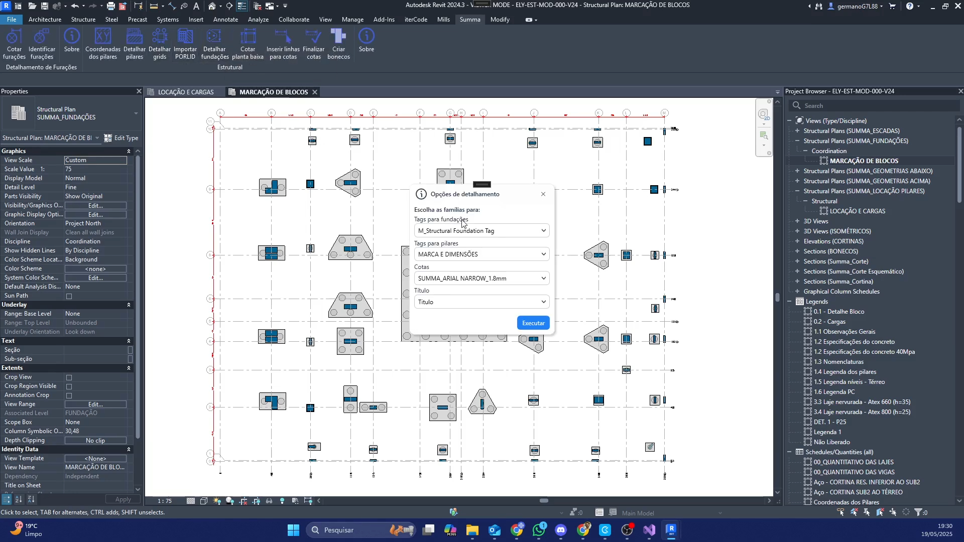 A ferramenta desenvolvida conta com diversas funcionalidades, que automatizam desde o detalhamento de grids, com inserção de cotas e identificadores personalizados, até o detalhamento completo dos blocos e sapatas de fundação, de acordo com os padrões do cliente. Ao final, a ferramenta identifica visualmente os elementos que não puderam ser detalhados automaticamente, facilitando a correção pelo usuário.